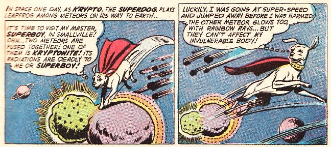 Krypto proved popular with comics readers in 1955, and so he soon returned and became a regular character in “Superboy” stories. By necessity he became much better behaved.
