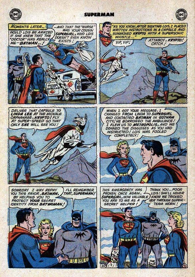 You might think that the Flame Dragon was Superman’s main problem in the story, but from the way it is constructed it seems that the bigger problem was preserving his dual identity. So Superman devises an elaborate scheme whereby Lois finds Clark Kent wrapped in bandages and being attended by a doctor and nurse. Clark persuades Lois that she didn’t see what she thought she had, and that in fact Clark suffered superficial burns from the Flame Dragon’s flames, and had dived into a ditch just as Superman showed up. Lois is gullible enough to believe this unlikely tale. After she leaves, the “doctor” is revealed to be Batman and the “nurse” turns out to be Supergirl, whose existence was unknown to Lois and the general public at that point in the continuity.