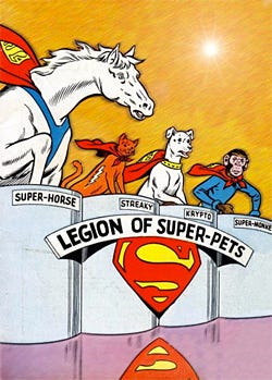 Furthermore, super-animals had proved to be popular with readers. Keep in mind that editor Mort Weisinger was aiming the Superman line of comics at children in the 1960s. So Weisinger also introduced Streaky the Super-Cat, Comet the Super-Horse, and Beppo the Super-Monkey. (Only Krypto and Beppo were from Krypton; Streaky and Comet derived their super-powers from other sources.) Together Krypto and the three other super-animals comprised the Legion of Super-Pets, an animal counterpart to the Legion of Super-Heroes.